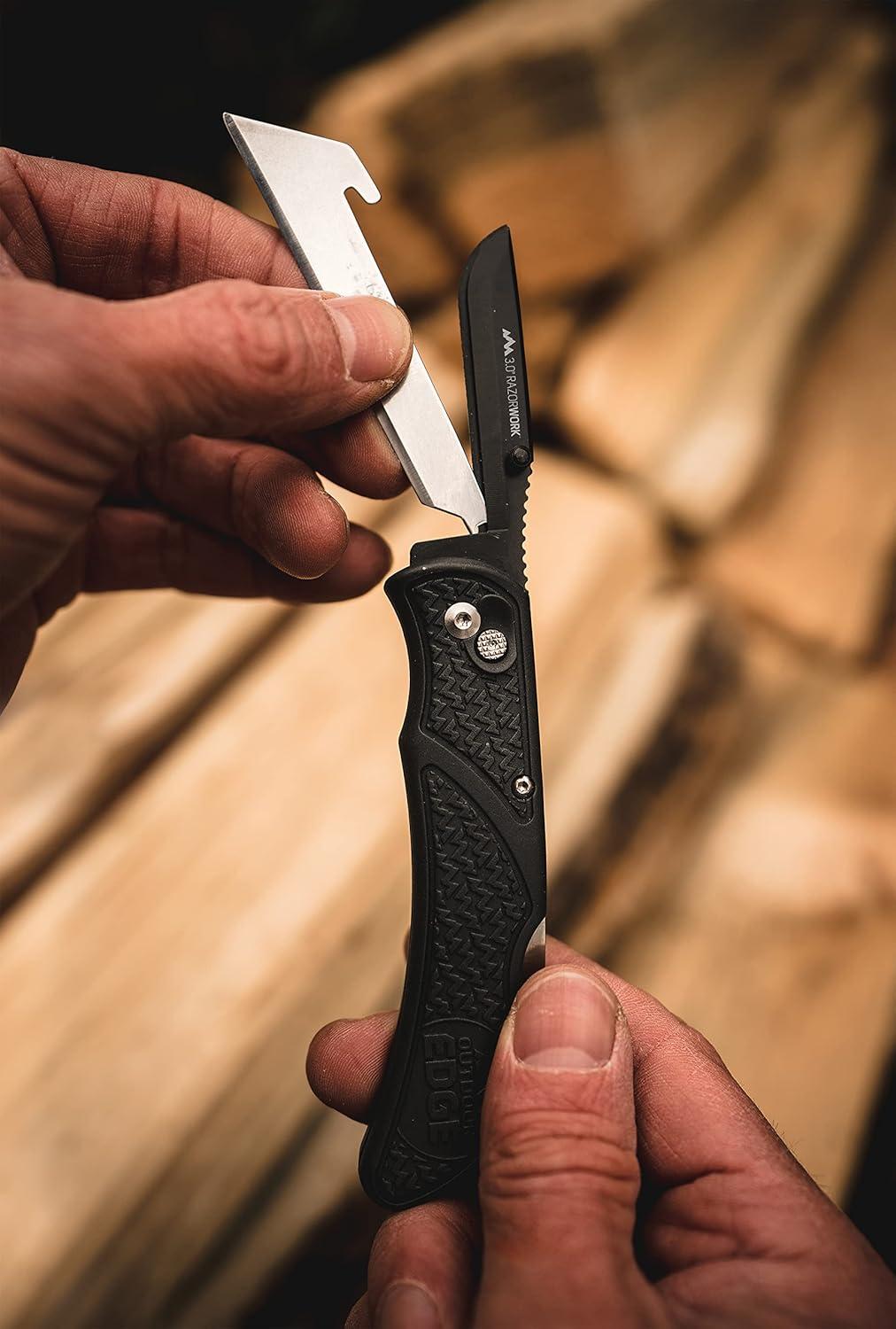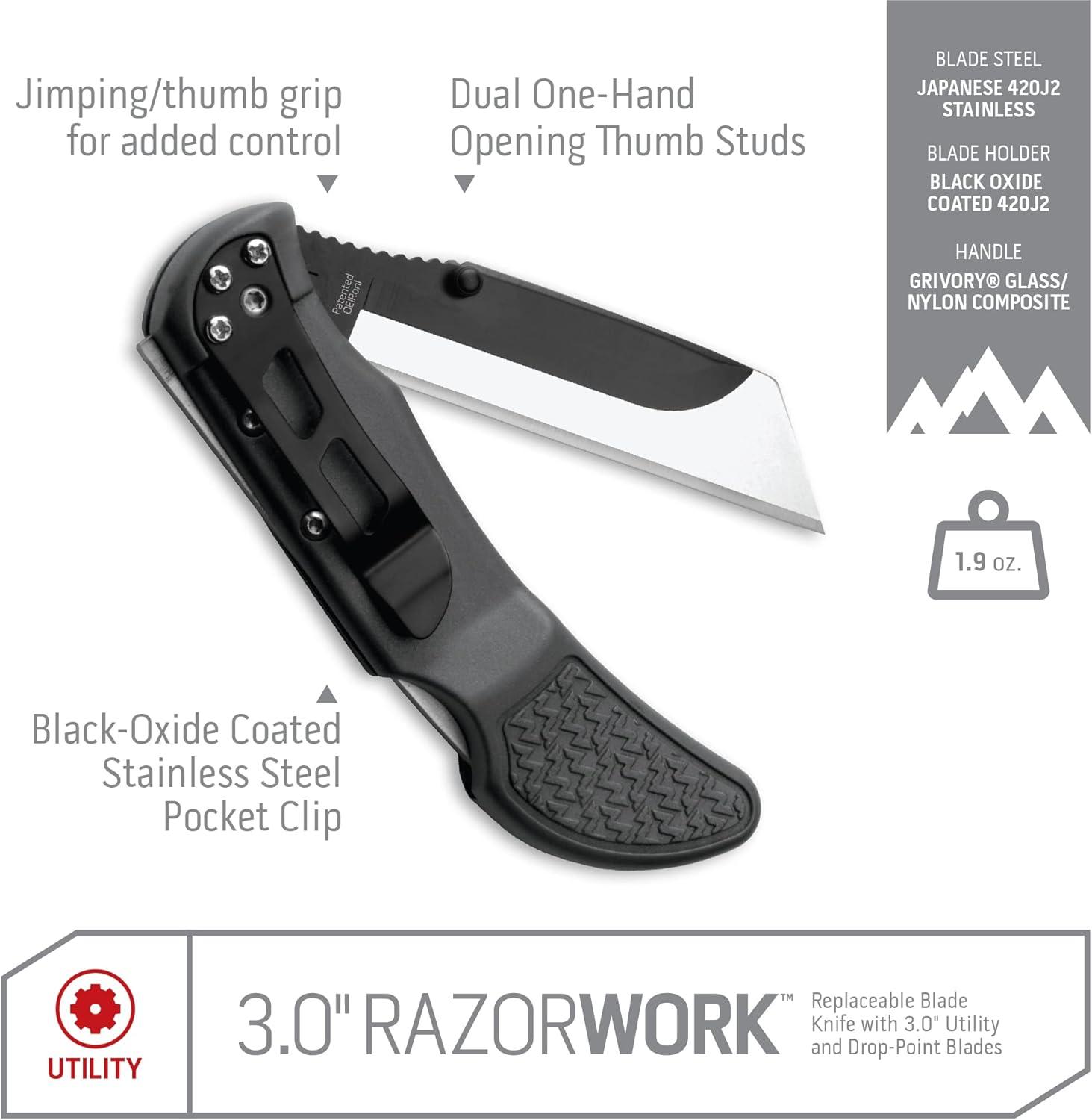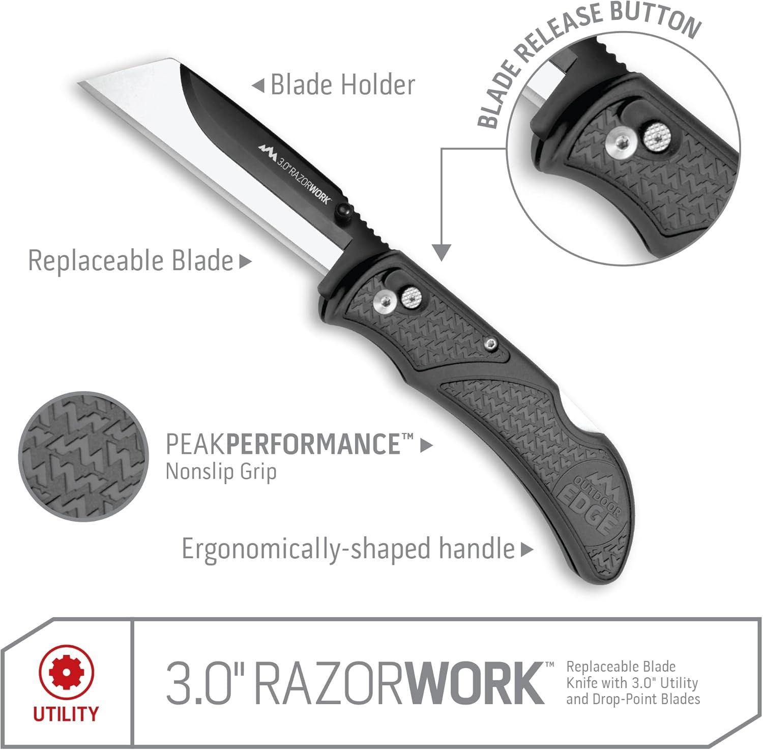 OUTDOOR EDGE 3.0″ RAZOR-WORK – RazorSafe Replaceable Blade Folding Utility Knife with Pocket Clip, 3X Cutting Edge, Shaving Sharp (Gray, 3 Blades)(Black)