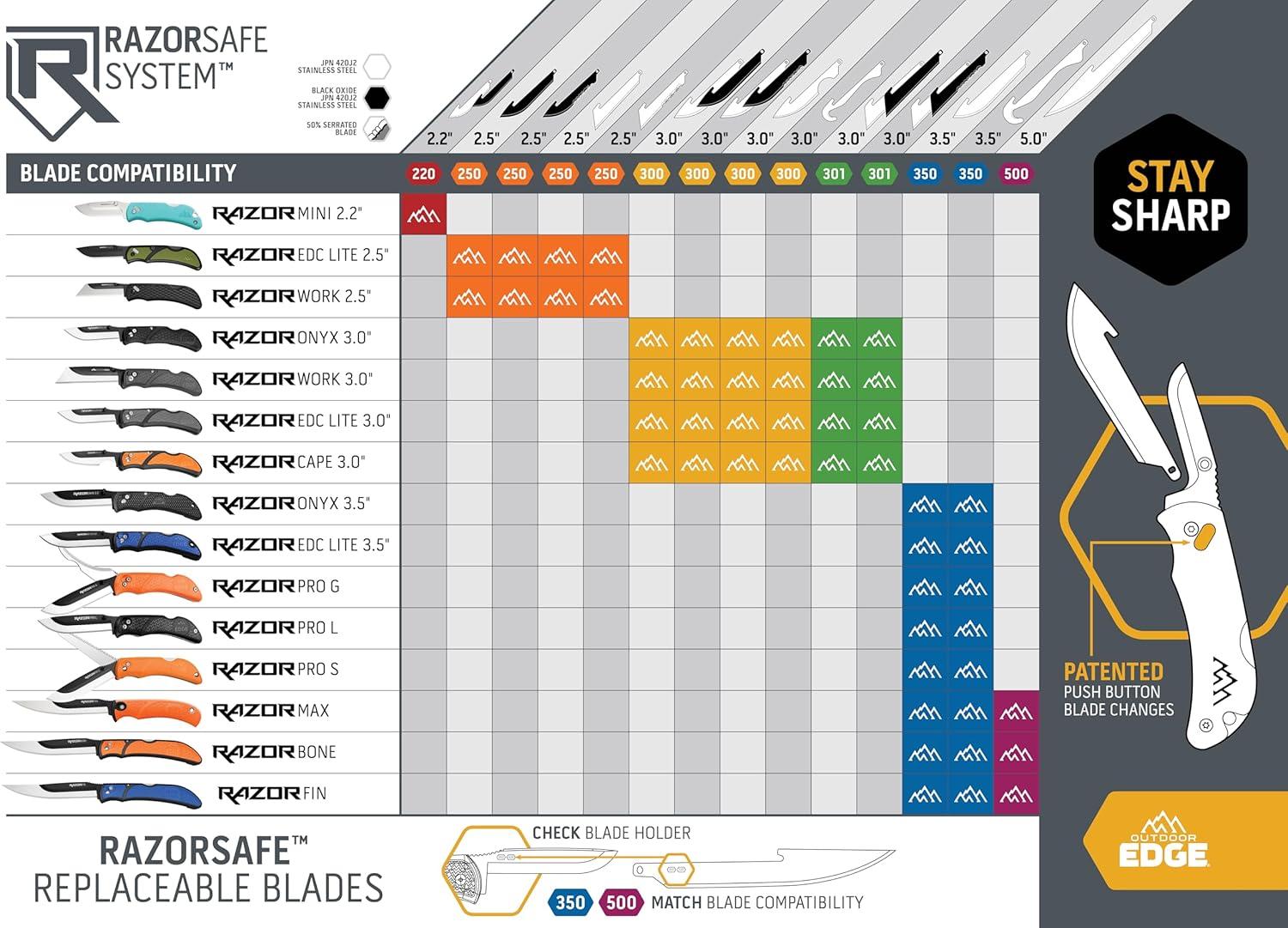 The next evolution of cutting-edge knife technology: Outdoor Edge’s RazorSafe System is a strong, fast and safe replaceable blade knife system. Each razor-sharp blade is securely seated in a black oxide-coated steel blade holder for rock-solid performance capable of any cutting task. Lightning-fast blade replacement is achieved by pressing the blade release button, safely located near the pivot, removing the dulled blade, and inserting a shaving sharp new one. Outdoor Edge offers multiple blade designs constructed from Japanese 420J2 stainless steel. Each blade is precisely heat-treated and finished to a shaving-sharp edge before they are individually vacuum sealed for safe transport. When the task at hand requires surgical precision and unsurpassed durability reach for a RazorSafe Series knife by Outdoor Edge.