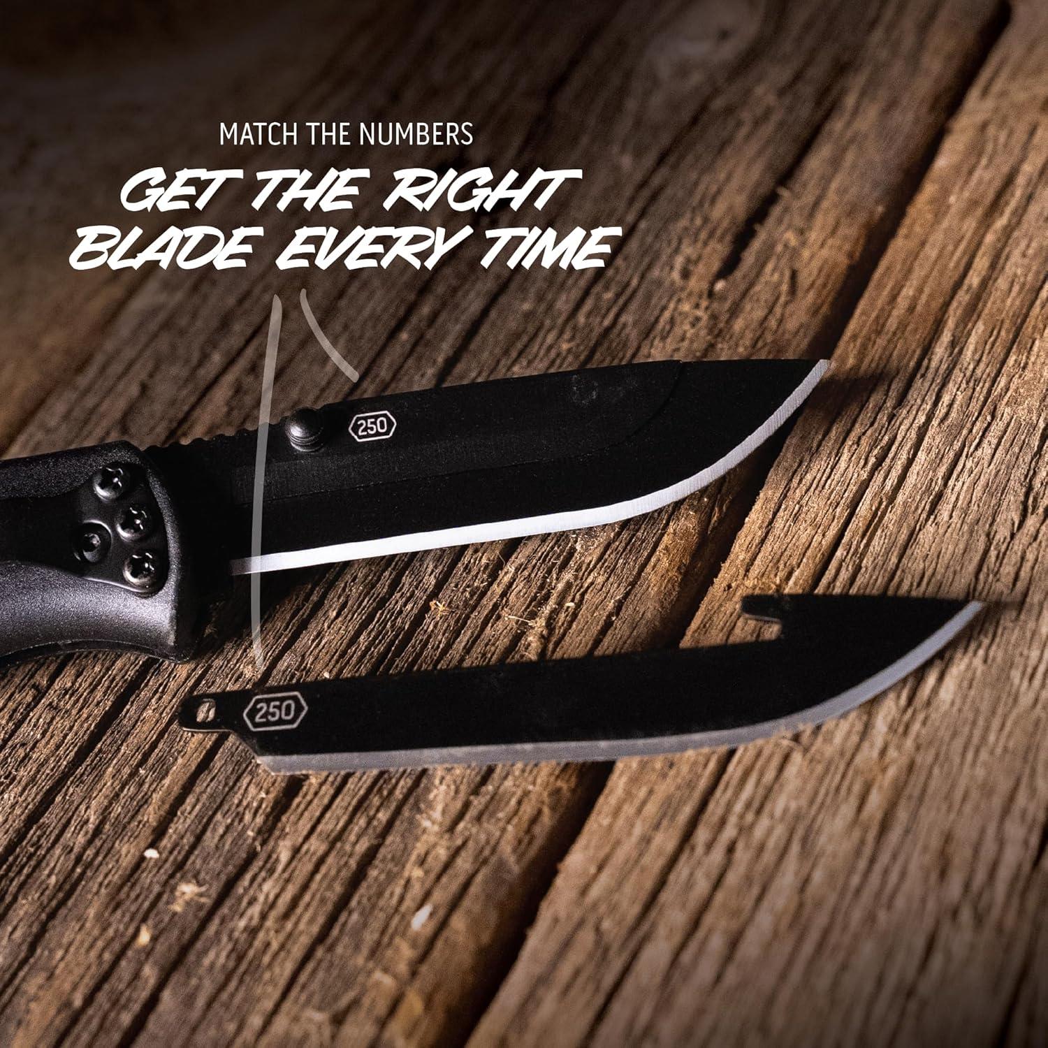 STAINLESS STEEL REPLACABLE BLADES – 2.5″ JAPANESE 420J2 stainless steel blades are precisely heat-treated to ensure excellent edge retention then hand finished sharp. Includes 2 block-oxide drop-point replacement blades total; Additional blade packs sold separately. Accepts all 250 RazorSafe series blades.