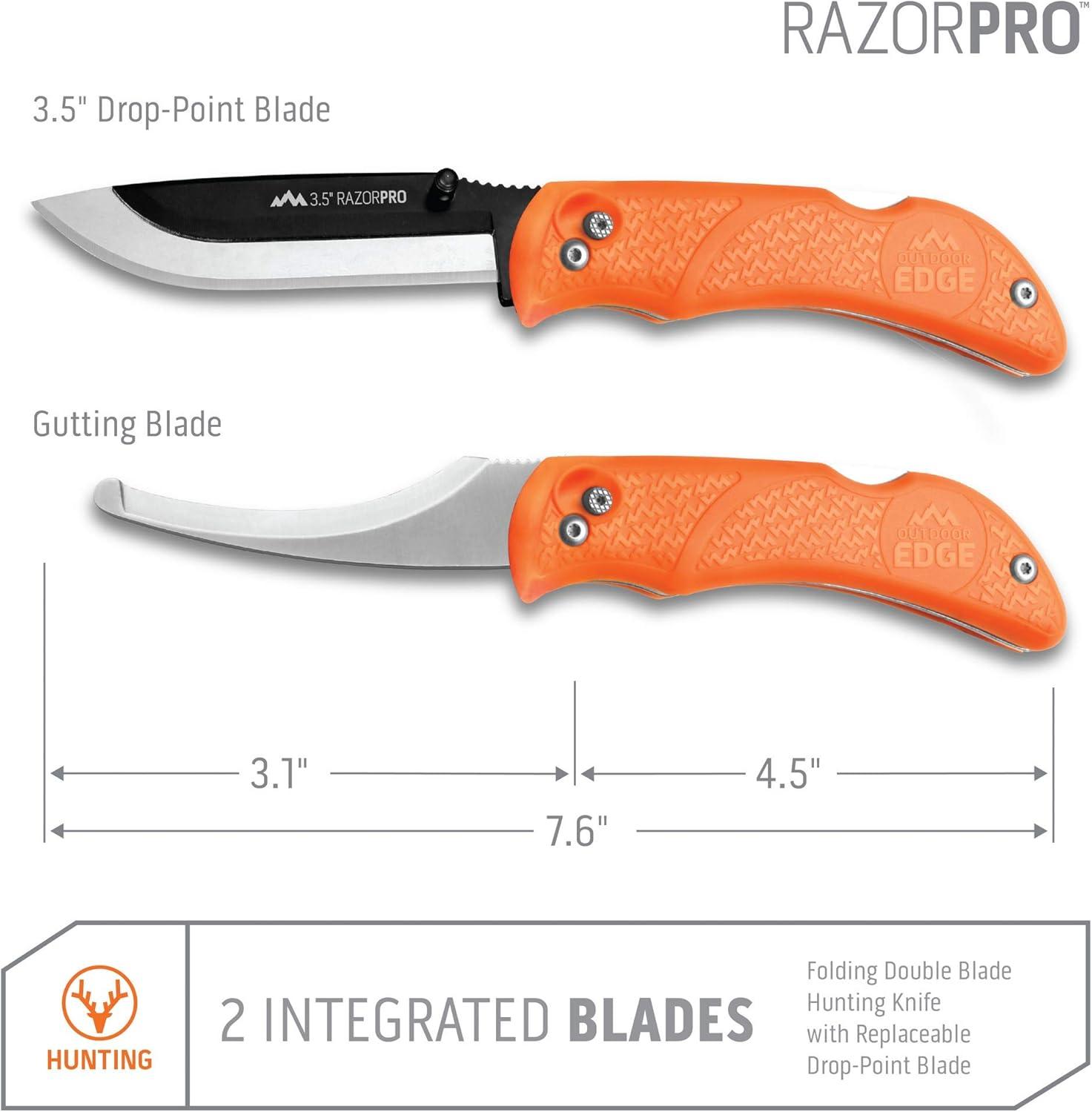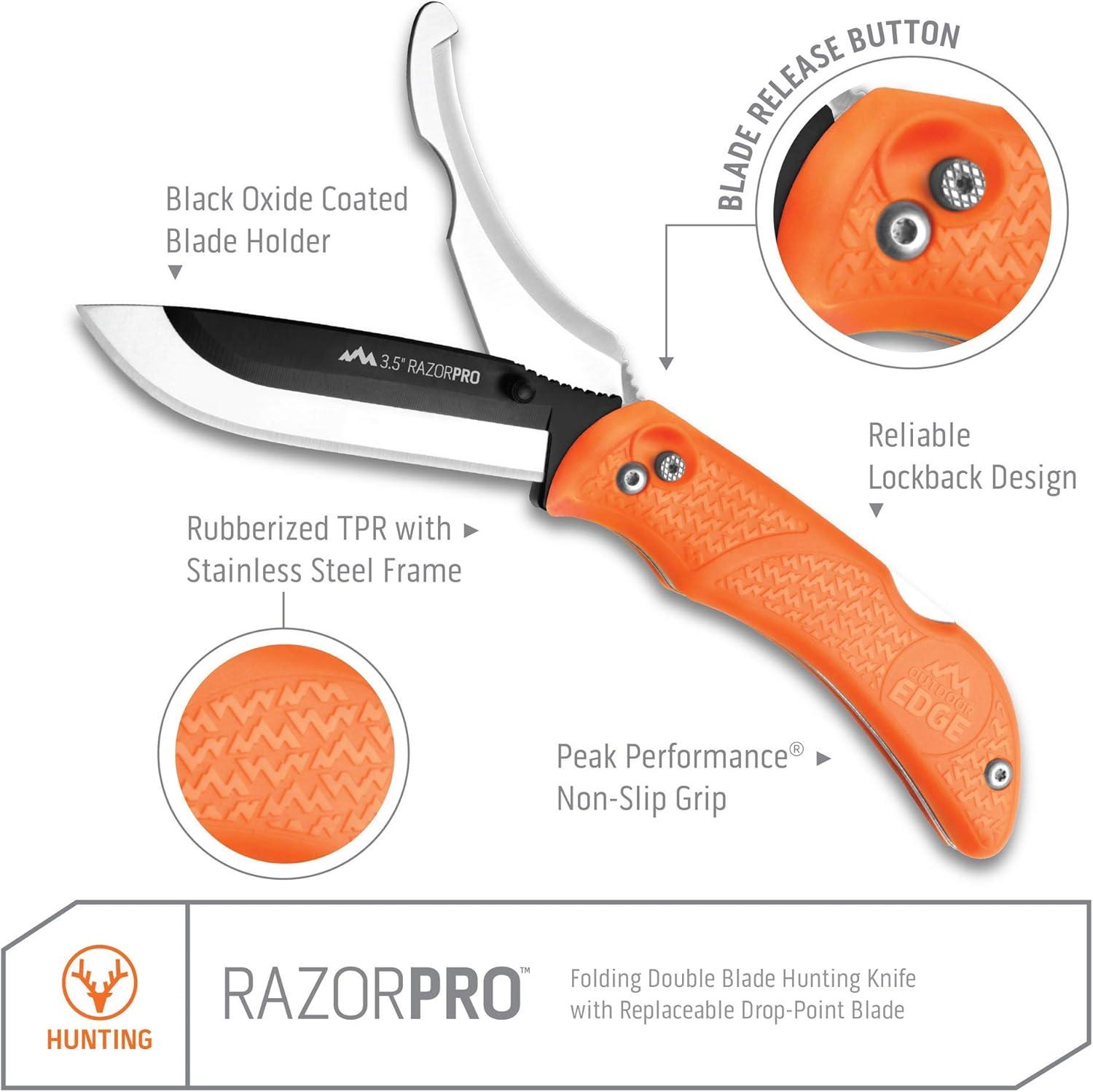 OUTDOOR EDGE RazorPro G Double Blade Hunting Knife – Replaceable Razor Sharp Skinning Blade & Gutting Knife for Fast Field Dressing, Non-Slip Black Handle, Black Sheath with 6 Extra Blades (Orange)(Orange (30 Blades))