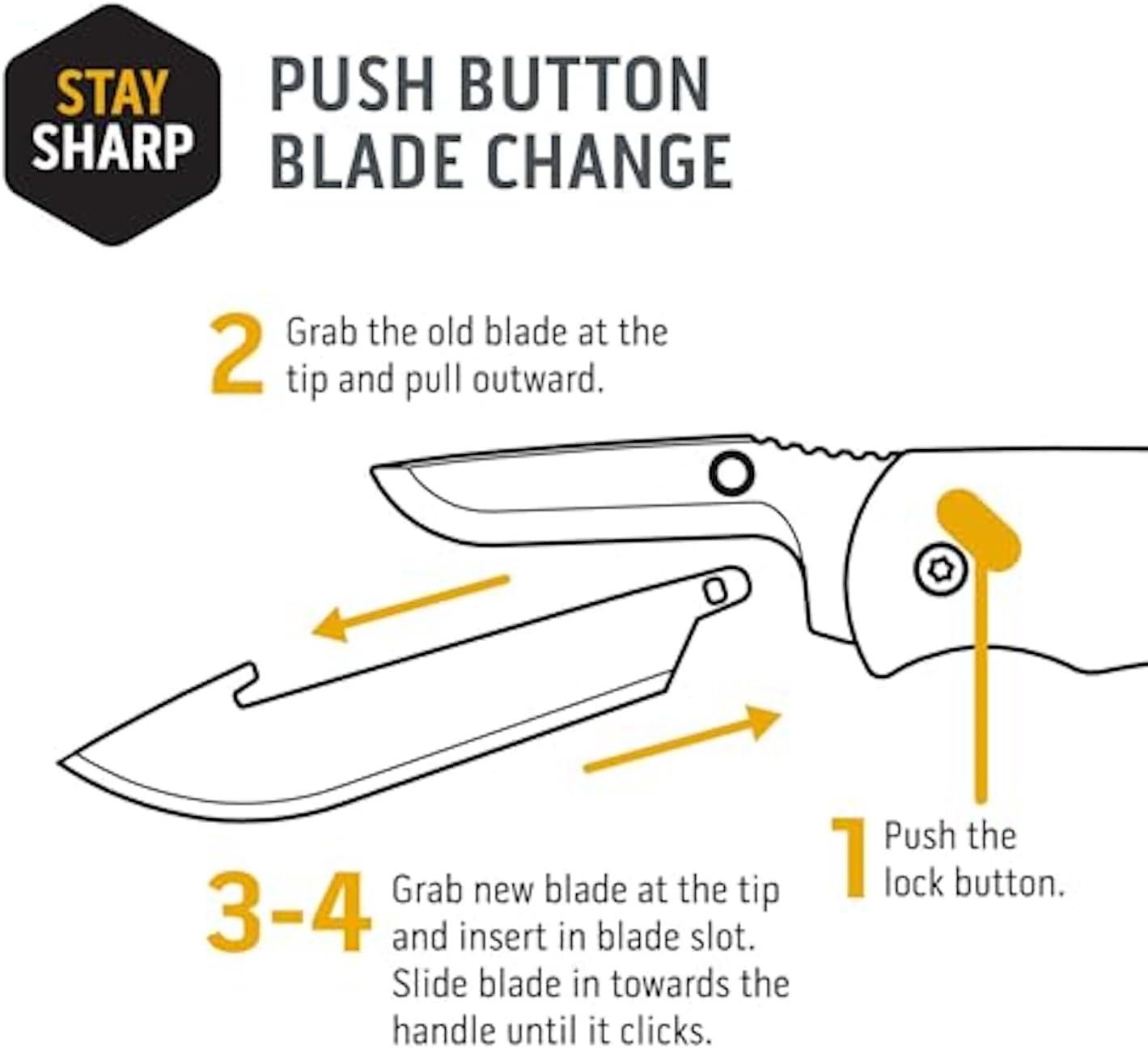 The next evolution of cutting-edge knife technology: Outdoor Edge’s RazorSafe System is a strong, fast and safe replaceable blade knife system. Each razor-sharp blade is securely seated in a black oxide-coated steel blade holder for rock-solid performance capable of any cutting task. Lightning-fast blade replacement is achieved by pressing the blade release button, safely located near the pivot, removing the dulled blade, and inserting a shaving sharp new one. Outdoor Edge offers multiple blade designs constructed from Japanese 420J2 stainless steel. Each blade is precisely heat-treated and finished to a shaving-sharp edge before they are individually vacuum sealed for safe transport. When the task at hand requires surgical precision and unsurpassed durability reach for a RazorSafe Series knife by Outdoor Edge.
